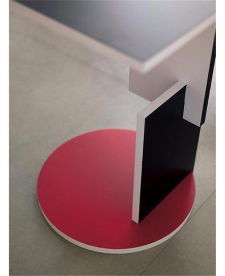 设计师Gerrit Rietveld是荷兰风格派的大师,追求以简单的结构、和谐的比例创造人居的舒适,以及水平、垂直线条与大块面体的搭构。该产品是为Utrech的Schroder House设计的,由一个蓝色方形顶部和红色圆形底座组成,是一个开放的形式。