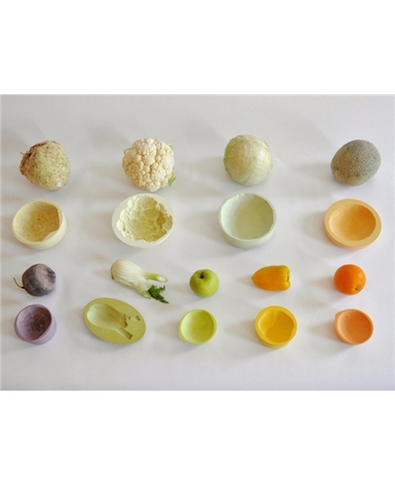负空间餐具是通过捕捉水果/蔬菜的印记而成形的碗的集合。利用蔬菜为基底,周围用陶瓷粉末充填,压印出来的模型依蔬果类型有不同的造型,容器会留下被蔬果压印出的刻痕,使用者可以与原蔬果产生对话,有独特性。目前,负空间餐具系列包括十个不同的碗,其中包括苹果、柠檬、橙子、辣椒、胡椒、茄子、纳帕白菜、糖瓜、菜花和卷心菜。